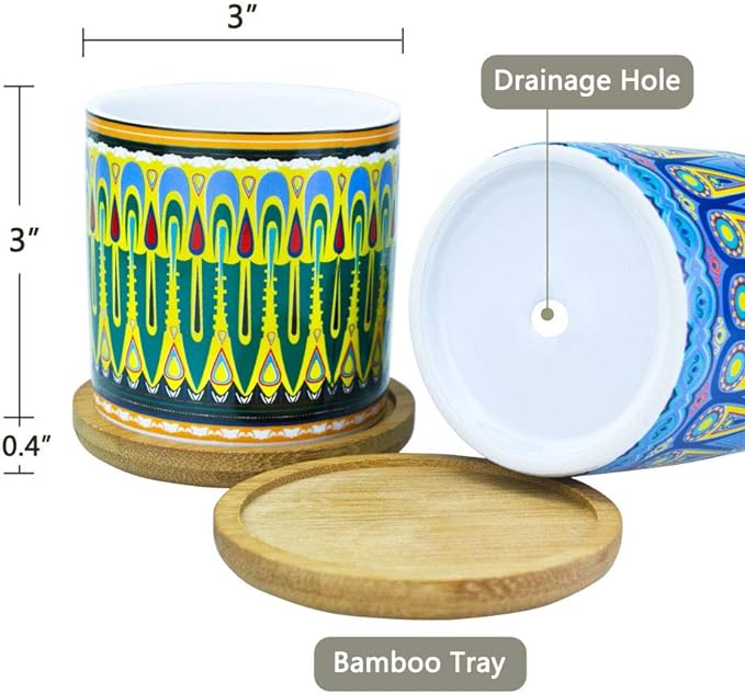 - 【Mandala Succulent Pots】- You will get 6 pack plant pots with bamboo coaster. ceramic pots approx size is 3"x 3"(L x W), bamboo coaster diameter 3.6", thickness 0.4". Notice: Plant is not included.