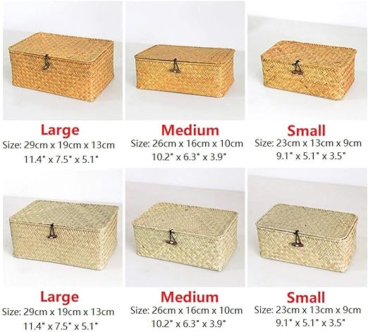 - ✔ Package Include: Set of 3 seagrass storage baskets with lid (S/M/L), Size S: 23 x 13 x 8cm; Size M: 26 x 16 x 10cm; Size L: 29 x 19 x 12cm. Contains ribbons, the colors of the ribbons are random
